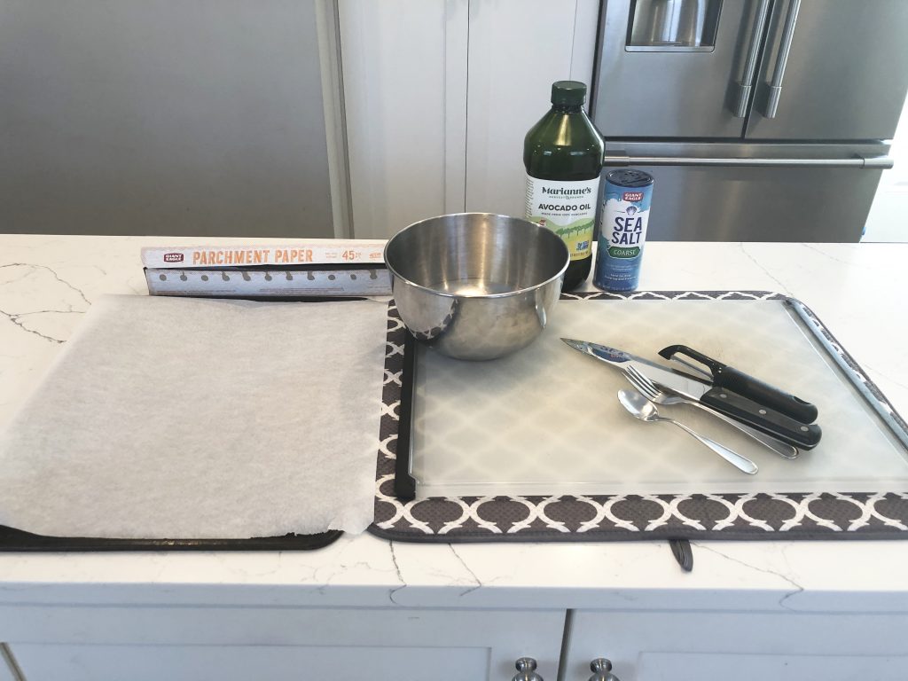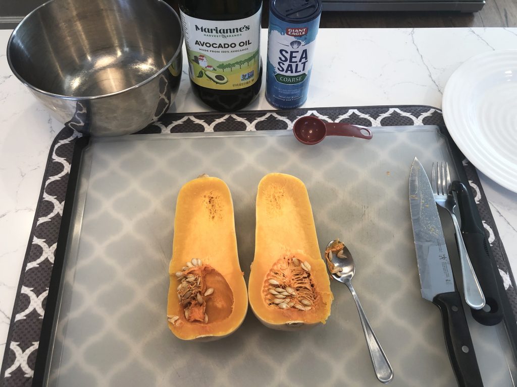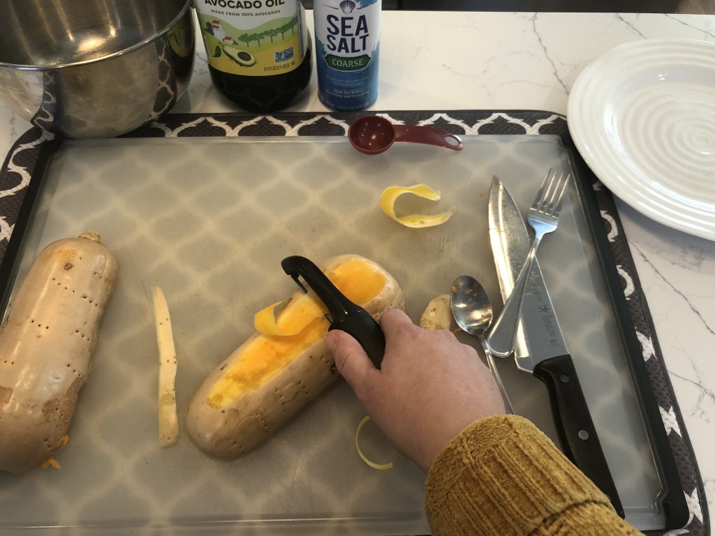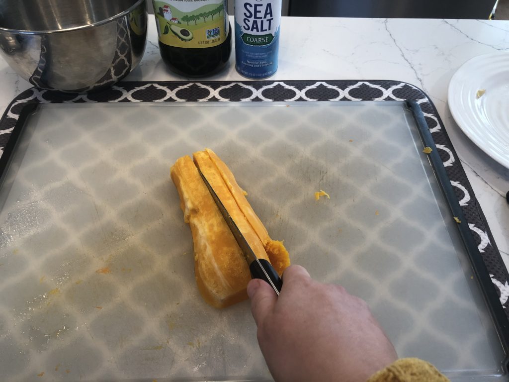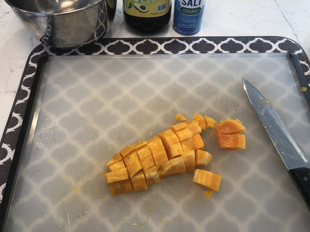 All recipes are similar- peel, cut, remove seeds, chop, coat with oil and salt, and roast at high heat. But, if you have ever tried to cut a butternut squash, you know it can be a little tricky, because it is so tough and hard.