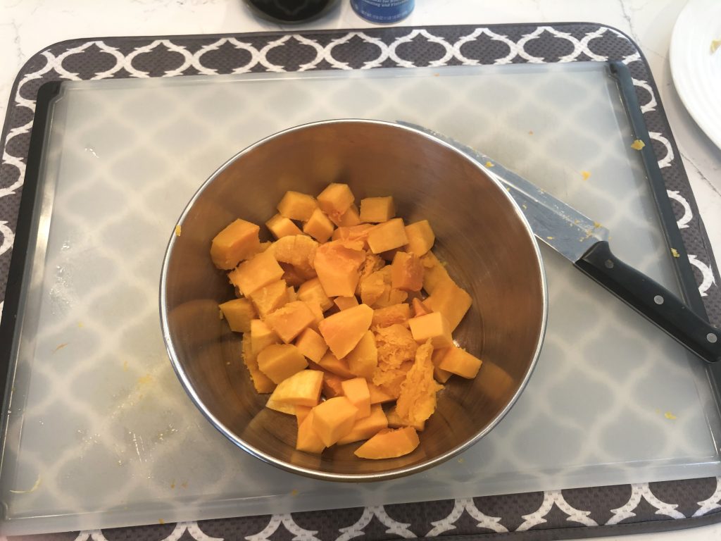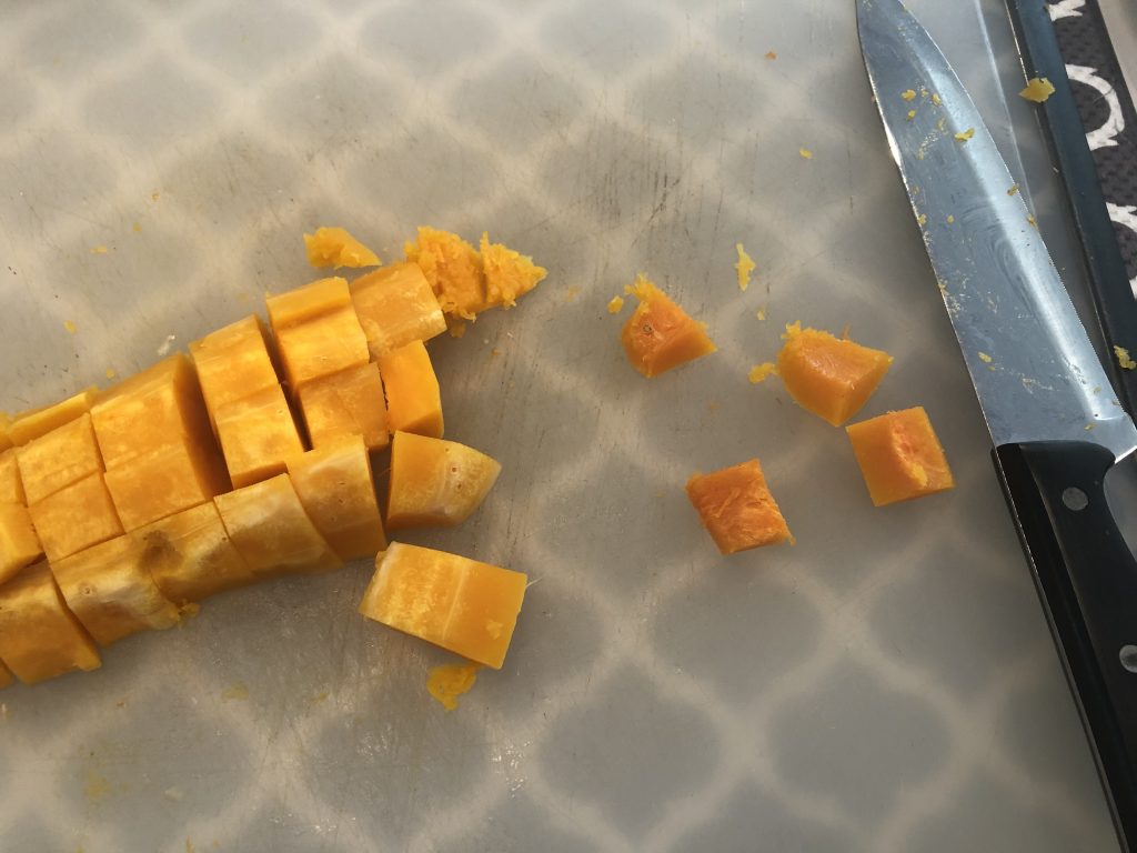 Next, cube the squash. I started by cutting the squash lengthwise.