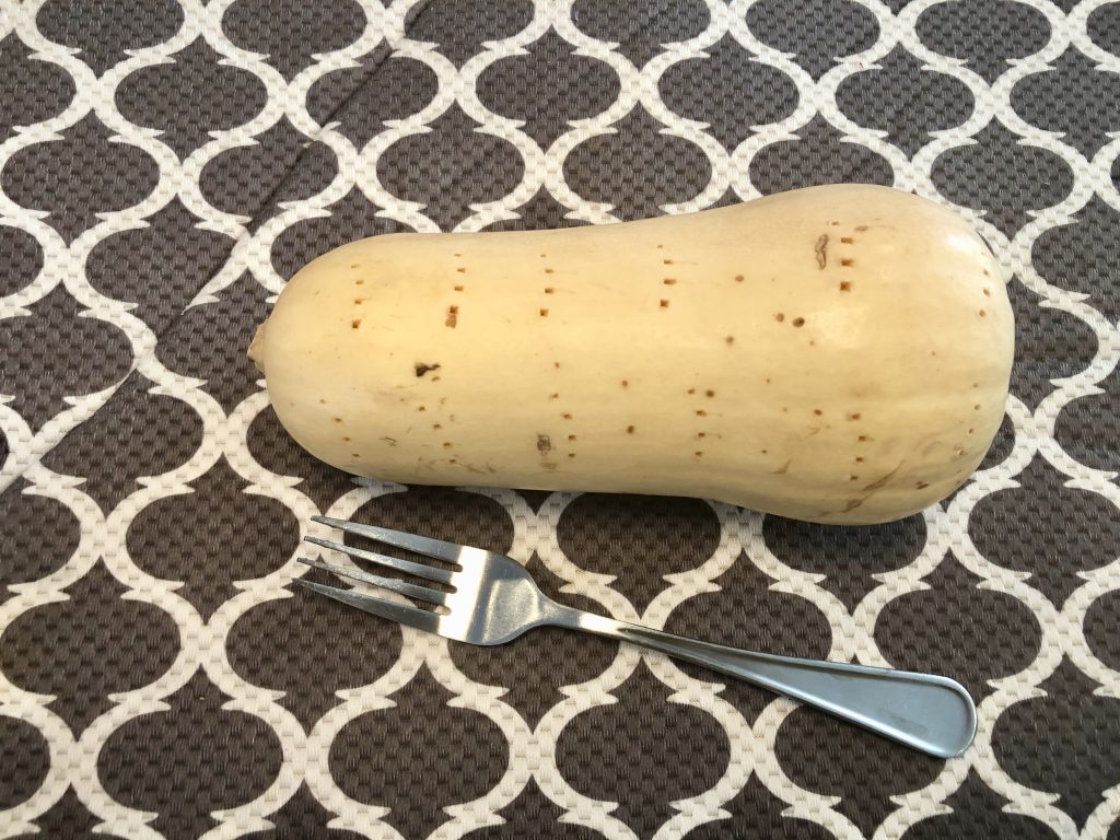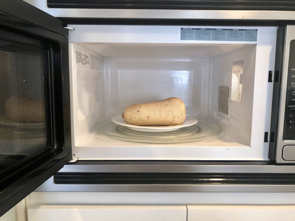 Place the pricked squash on a microwave safe plate. Then microwave the squash for 3 minutes. This secret trick will slightly steam the squash (you may even hear it making a faint whistle sound). The steam softens the skin and squash making it easier to peel and cut. It’s a simple tip, but it really makes the next steps so much easier.