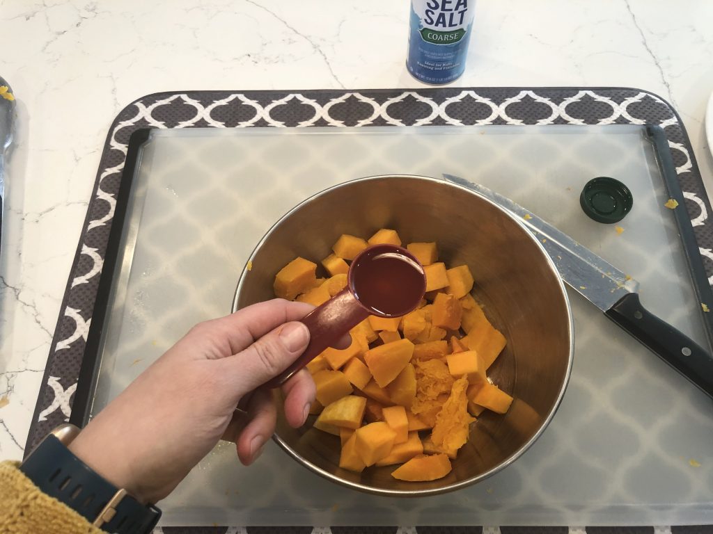 Stir the squash until each cube is coated.
