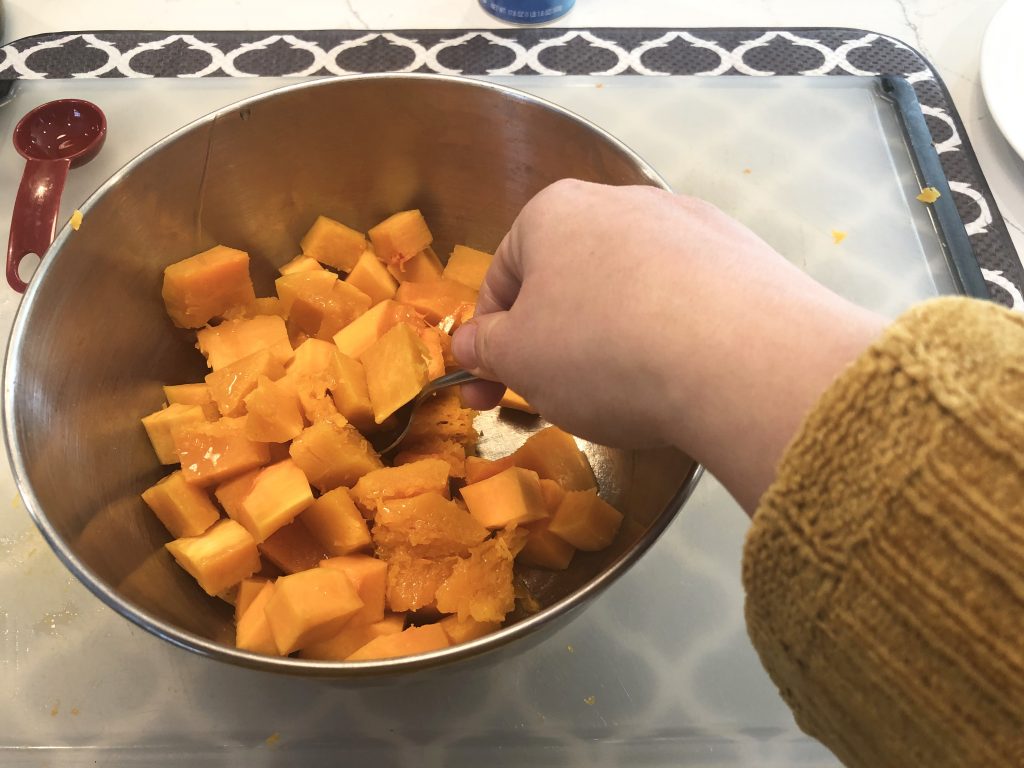 Add cubed squash to the mixing bowl.