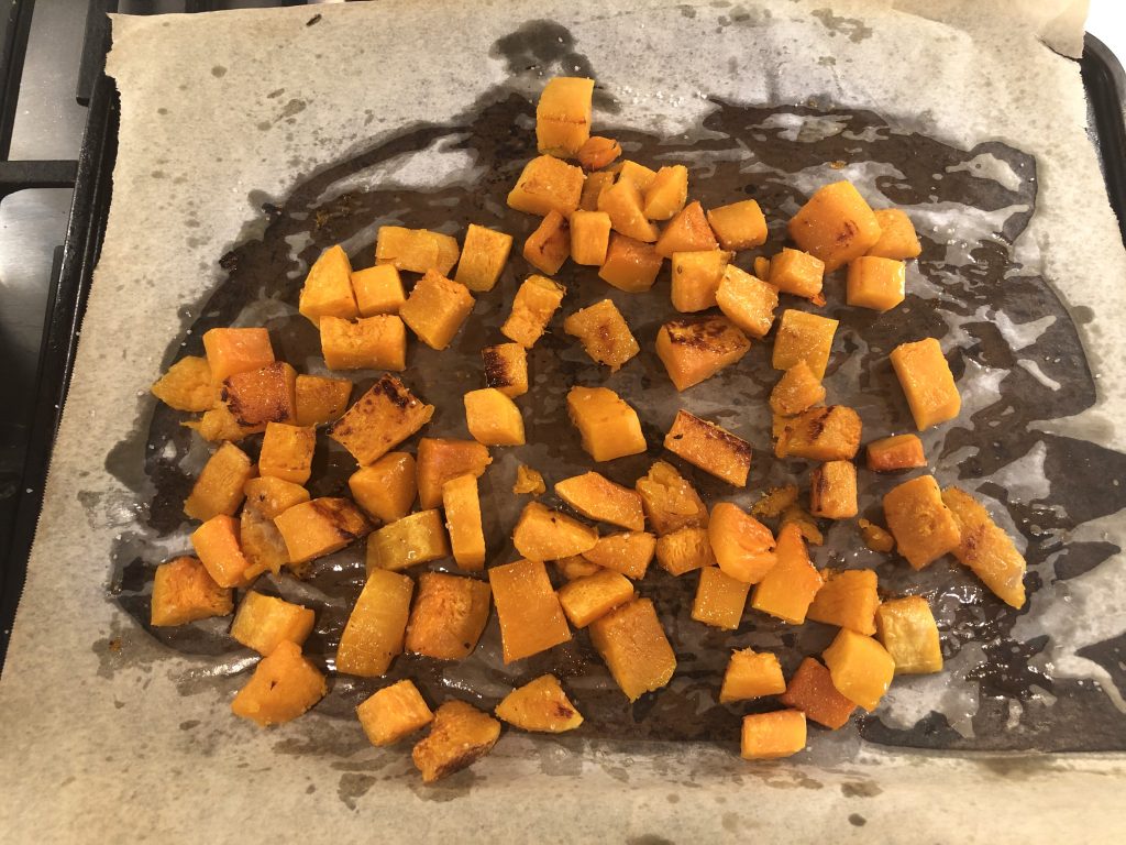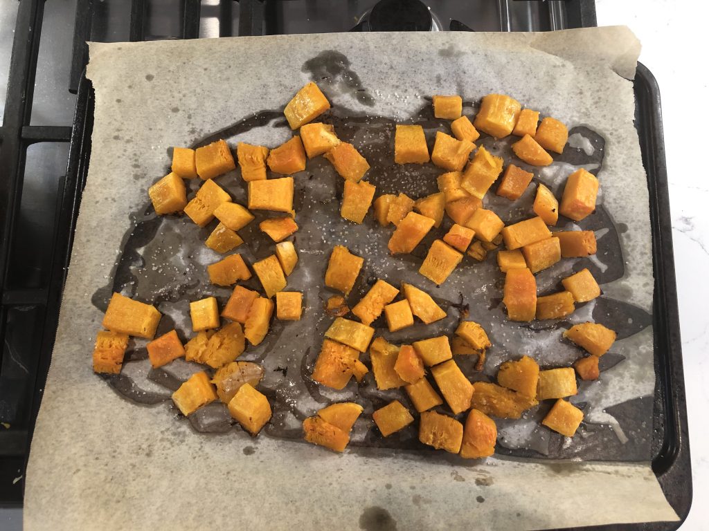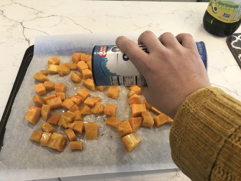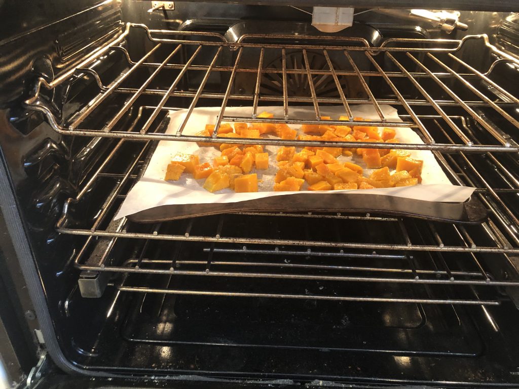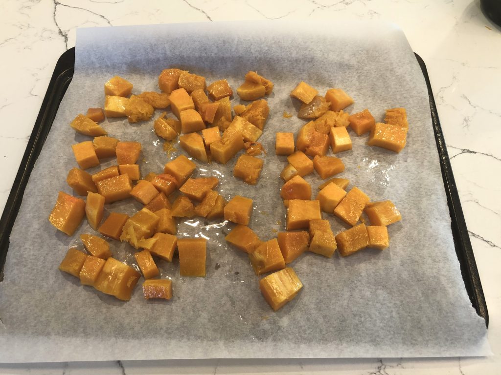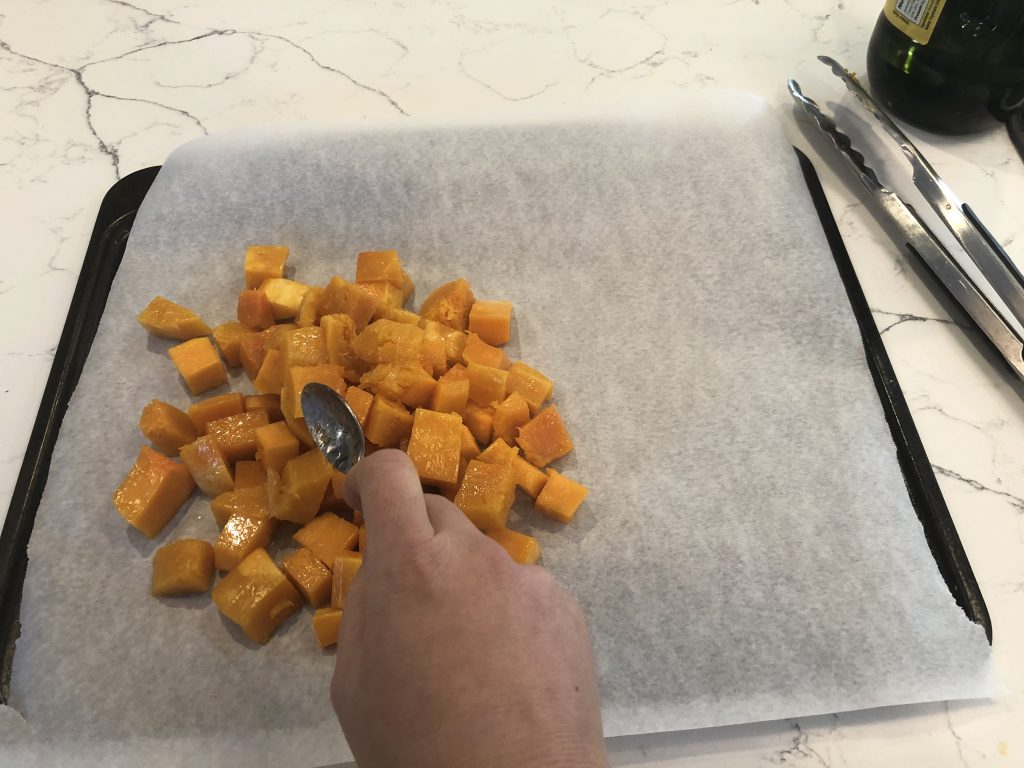 Spread the butternut squash in a single layer on a parchment lined baking sheet.