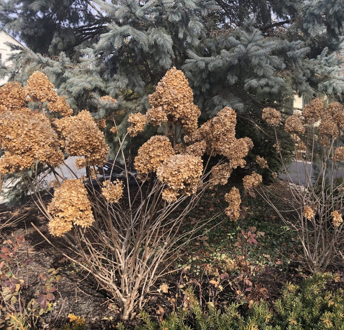Dried flower heads add an interesting texture and a bit of whimsy to the winter garden. Hydrangeas in particular are stand outs. When planted en masse, they create a natural fence between yards or within your own garden. The flowers can also be used in wreathes, dried flower arrangements, and countless other winter projects.